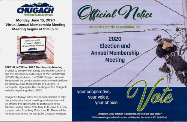 Online voting for the 2020 Election is now open! Chugach Electric members, by now you should have received your ballot by email. You can cast your ballot online using the direct link provided in the email or the VOTE button below. If you did not receive your email you can call (907) 646-7394 or 1-888-729-4679 for assistance.